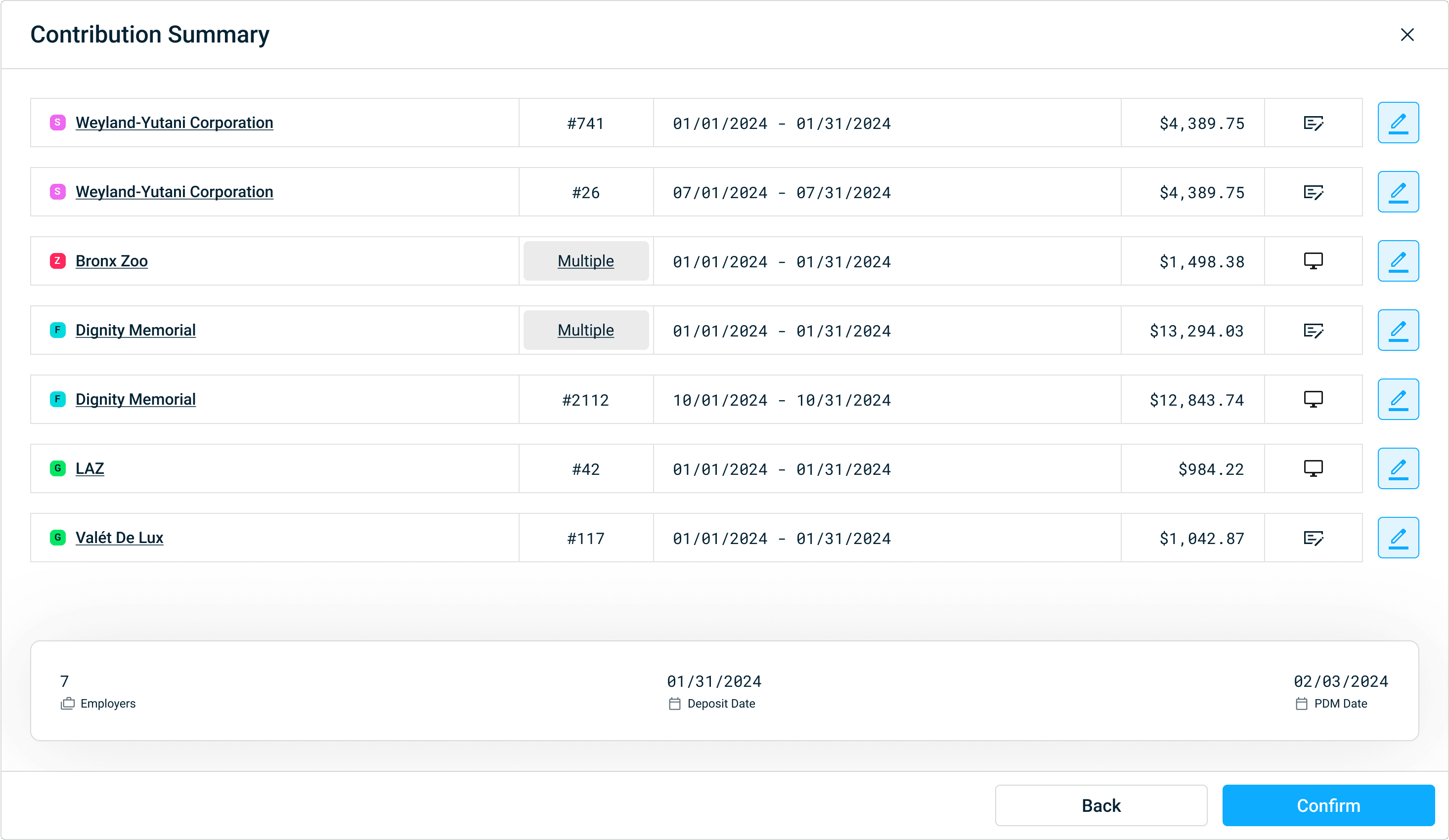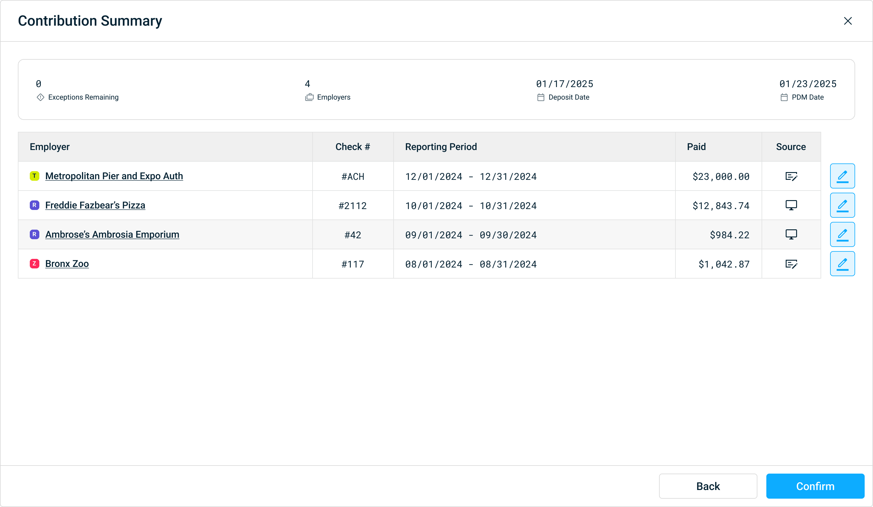 Contribution Summary screen provides the user with a final, high-level overview of all the payments that will be reconciled and updated in the system. It is a critical step that builds trust by giving the user a chance to review both the system's automated work and their own manual inputs before a final confirmation.